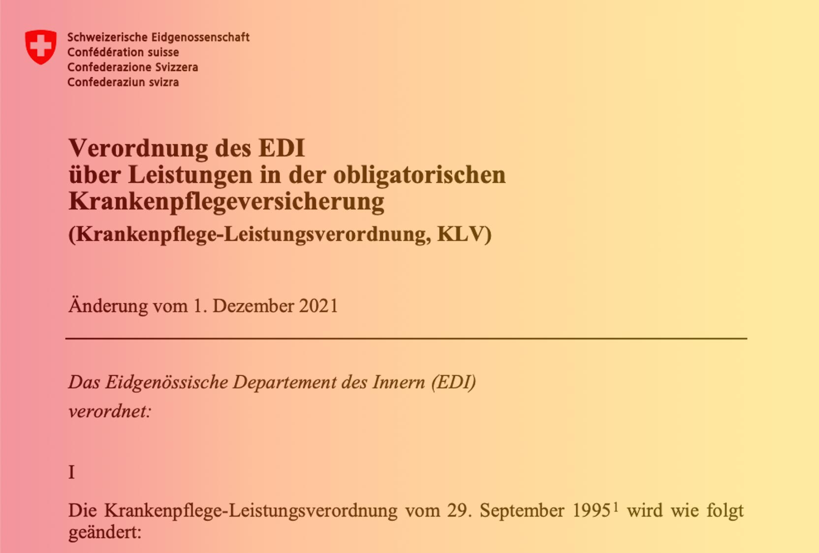 Für die Schweiz, wo es mit dem 18. bzw. 20. Lebensjahr zum Übergang der Zuständigkeit von der Invalidenversicherung in die Krankenversicherung kommt ein wichtiges Urteil. Die Übernahme der Kosten erfolgt aufgrund des geänderten KLV (Krankenversicherungsleistungsverzeichnis) die obligatorische Krankenversicherung. Diese Bestimmung ist gültig seit dem 01.01.2022.